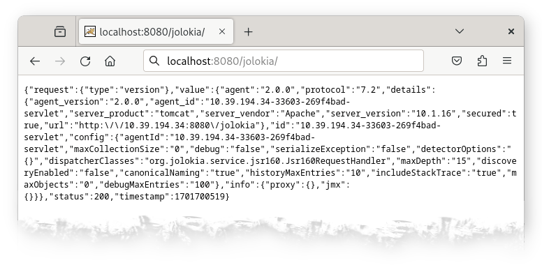 Per l’installazione dell’agent vi basta deployare il war all’interno del vostro application server da monitorare, se tutto va per il verso giusto, chiamando l’indirizzo http://localhost:8080/jolokia/version dovreste ricevere come risposta un JSON di questo tipo: